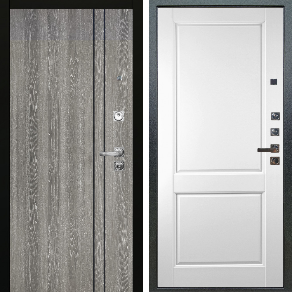 Входная дверь Верона Графит с внутренней отделкой Вертикаль белый матовый • Габаритные размеры: 2050x860 мм, 2050x960 мм • Металл 1.8мм • Внешнее покрытие: МДФ 16 мм. • Толщина полотна: 115 мм. • Толщина коробки: 120 мм. • Короб закрытого типа, утепленный • Уплотнитель: 3 контура • Два вертикальных ребра жесткости • Замок основной: Гардиан 6211 с блокировкой язычка • Замок дополнительный: Гардиан 6001 • Врезная броненакладка • Пазы на коробке под доборы • Независимая задвижка есть • Фурнитура Черная