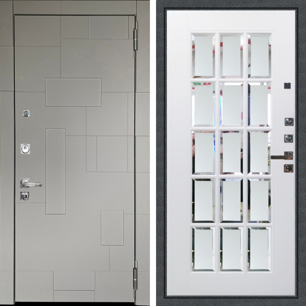 Входная дверь Termo-Door с утеплением: внешняя отделка Квантум Грей, внутренняя отделка Нео White.Толщина полотна 100 мм., цилиндровый замок, доставка и установка в Москве и МО, гарантия 1 год.
