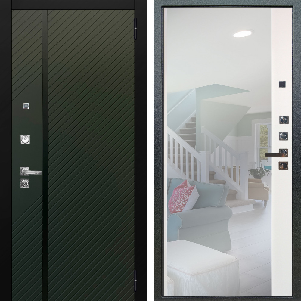 Входная дверь Гранит SMART с внутренней отделкой Зеркало СБ-16 сандал белый • Габаритные размеры: 2050x860 мм, 2050x960 мм • Металл 1.8мм. Черная шагрень • Внешнее покрытие: МДФ 12 мм. • Толщина полотна: 115 мм. • Толщина коробки: 120 мм. • Короб закрытого типа, утепленный • Уплотнитель: 3 контура • Два вертикальных ребра жесткости • ЭЛЕКТРОННЫЙ ЗАМОК НА ВЫБОР • Замок дополнительный: Гардиан 6001 • Врезная броненакладка • Пазы на коробке под доборы • Независимая задвижка есть • Фурнитура ЧЕРНАЯ