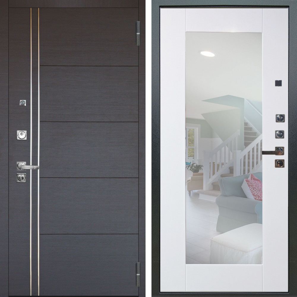 Входная дверь Гранд Белый Мат с внутренней отделкой Зеркало панорама Графит • Габаритные размеры: 2050x860 мм, 2050x960 мм • Металл 1.8мм • Внешнее покрытие: МДФ 16 мм. • Толщина полотна: 115 мм. • Толщина коробки: 120 мм. • Короб закрытого типа, утепленный • Уплотнитель: 3 контура • Два вертикальных ребра жесткости • Замок основной: Гардиан 6211 с блокировкой язычка • Замок дополнительный: Гардиан 6001 • Врезная броненакладка • Пазы на коробке под доборы • Независимая задвижка есть • Фурнитура Хром