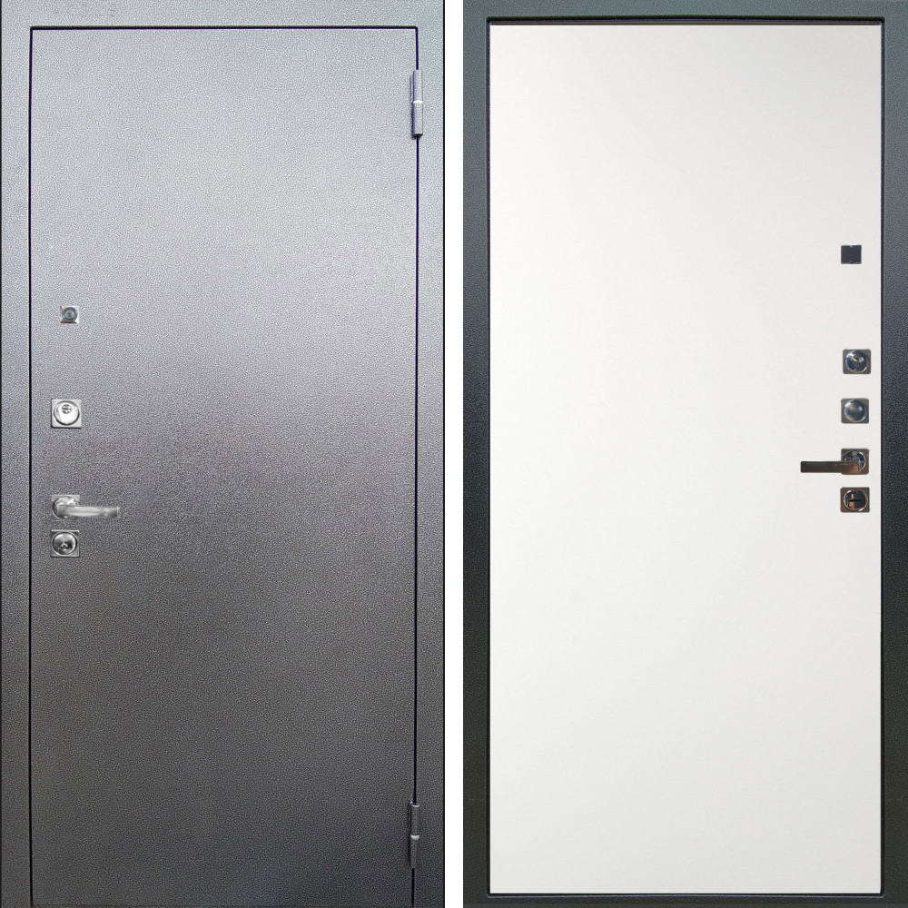 Входная дверь Termo-Door с утеплением: внешняя отделка Техно Серебро Антик, внутренняя отделка Flat Grey софт.Толщина полотна 90 мм., цилиндровый замок, доставка и установка в Москве и МО, гарантия 1 год.
