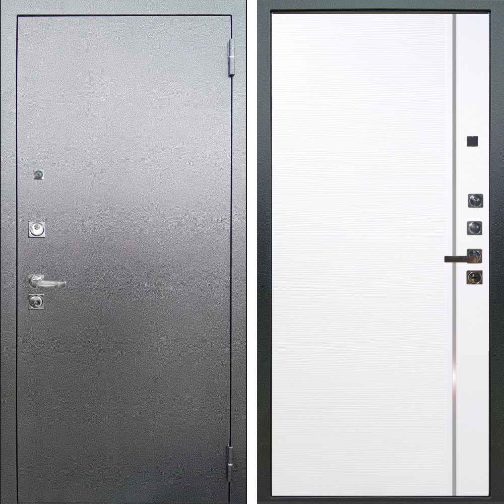Полотно - два листа металла, Замковая зона усилена металлическим бронепакетом. Ответная часть замковой зоны усилена стальным швеллером,что сводит к минимуму попытки вскрытия двери методом отжима. Бронепластины на коробе в зоне входа ригелей замка. 2 специальных армированных прута внутри конструкции надёжно защитят дверь от вскрытия килечным ножом.