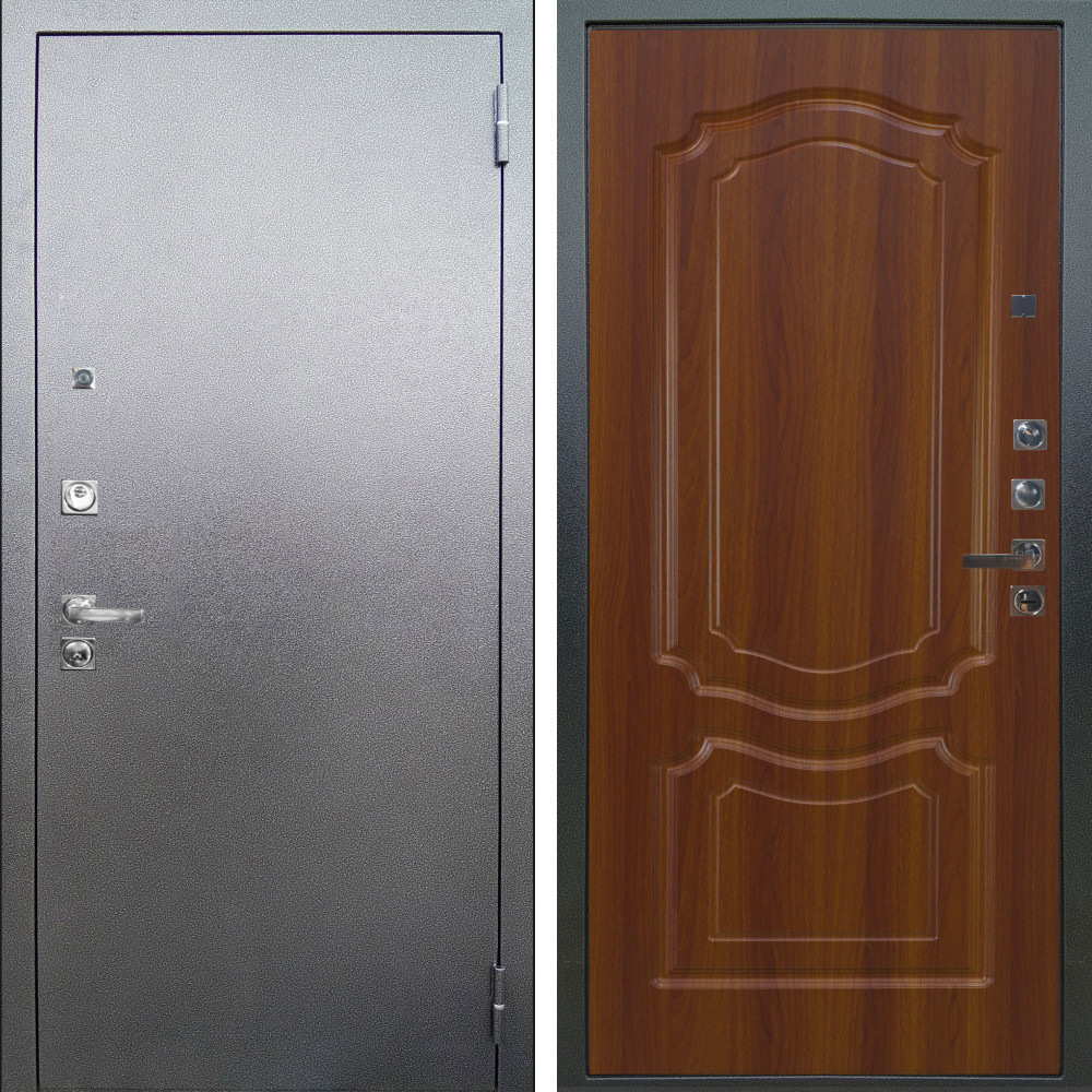 Полотно - два листа металла, Замковая зона усилена металлическим бронепакетом. Ответная часть замковой зоны усилена стальным швеллером,что сводит к минимуму попытки вскрытия двери методом отжима. Бронепластины на коробе в зоне входа ригелей замка. 2 специальных армированных прута внутри конструкции надёжно защитят дверь от вскрытия килечным ножом.