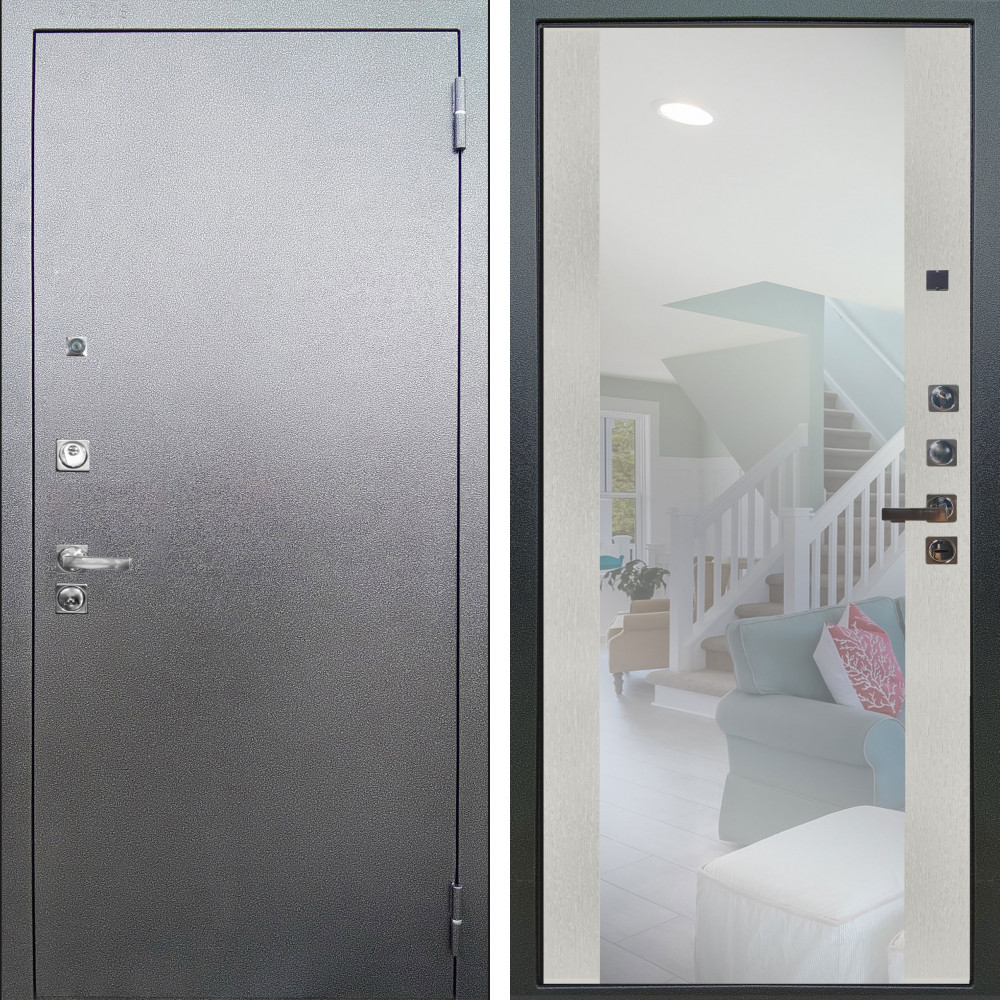 Входная дверь Гранит SMART с внутренней отделкой Зеркало сандал белый • Габаритные размеры: 2050x860 мм, 2050x960 мм • Металл 1.8мм. Черная шагрень • Внешнее покрытие: МДФ 12 мм. • Толщина полотна: 115 мм. • Толщина коробки: 120 мм. • Короб закрытого типа, утепленный • Уплотнитель: 3 контура • Два вертикальных ребра жесткости • ЭЛЕКТРОННЫЙ ЗАМОК НА ВЫБОР • Замок дополнительный: Гардиан 6001 • Врезная броненакладка • Пазы на коробке под доборы • Независимая задвижка есть • Фурнитура ЧЕРНАЯ