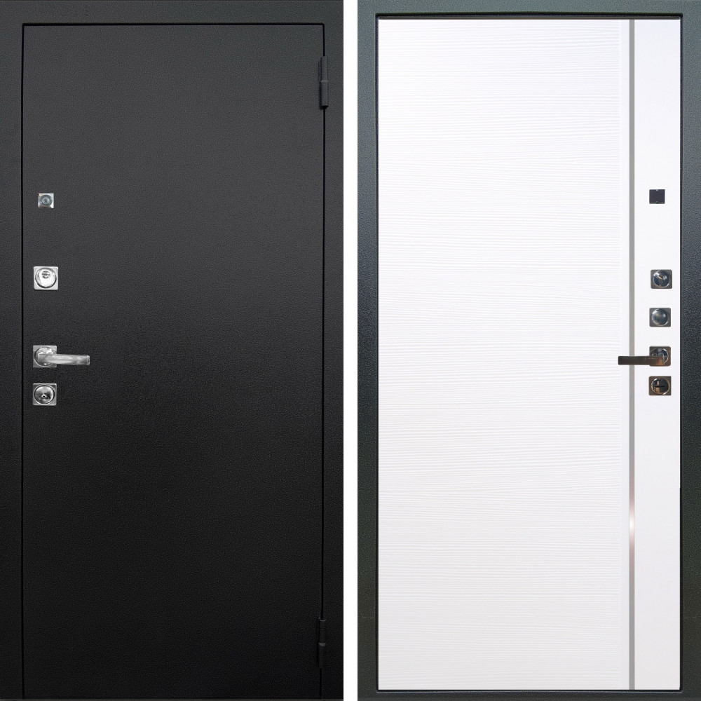 Входная дверь Шторм Графит с внутренней отделкой Зеркало сандал белый • Габаритные размеры: 2050x860 мм, 2050x960 мм • Металл 1.5мм. • Внешнее покрытие: МДФ 12 мм. • Цвет покрытия: Графит. • Толщина полотна: 100 мм. • Толщина коробки: 105 мм. • Окрас короба:Черная шагрень. • Короб закрытого типа, утепленный. • Уплотнитель: 3 контура. • Два вертикальных ребра жесткости. • Замок основной: Guardian 3211 (цилиндровый). • Замок дополнительный: Guardian 300 • Врезная броненакладка. • Независимая задвижка есть. • Фурнитура Черная.