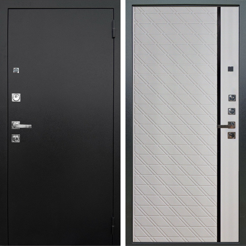 Входная дверь Вертикаль Блек SMART с внутренней отделкой Сити белый матовый • Габаритные размеры: 2050x860 мм, 2050x960 мм • Металл 1.8мм. Черная шагрень • Внешнее покрытие: МДФ 12 мм. • Толщина полотна: 115 мм. • Толщина коробки: 120 мм. • Короб закрытого типа, утепленный • Уплотнитель: 3 контура • Два вертикальных ребра жесткости • ЭЛЕКТРОННЫЙ ЗАМОК НА ВЫБОР • Замок дополнительный: Гардиан 6001 • Врезная броненакладка • Пазы на коробке под доборы • Независимая задвижка есть • Фурнитура ЧЕРНАЯ