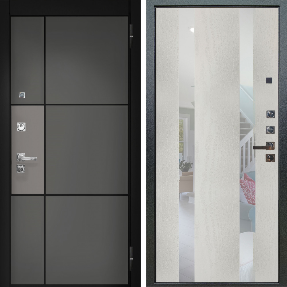 Входная дверь Шторм Графит с внутренней отделкой Зеркало сб-16 черный кварц • Габаритные размеры: 2050x860 мм, 2050x960 мм • Металл 1.5мм. • Внешнее покрытие: МДФ 12 мм. • Цвет покрытия: Графит. • Толщина полотна: 100 мм. • Толщина коробки: 105 мм. • Окрас короба:Черная шагрень. • Короб закрытого типа, утепленный. • Уплотнитель: 3 контура. • Два вертикальных ребра жесткости. • Замок основной: Guardian 3211 (цилиндровый). • Замок дополнительный: Guardian 300 • Врезная броненакладка. • Независимая задвижка есть. • Фурнитура Черная.