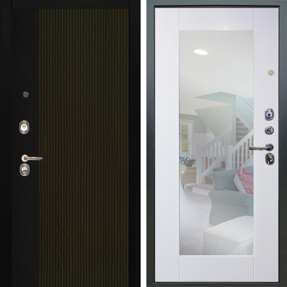 Входная дверь Шторм с внутренней отделкой Зеркало панорама Белый софт • Габаритные размеры: 2050x860 мм, 2050x960 мм • Металл 1.5мм. • Внешнее покрытие: МДФ 12 мм. • Цвет покрытия: Дуб кантри черный. • Толщина полотна: 100 мм. • Толщина коробки: 105 мм. • Окрас короба:Черная шагрень. • Короб закрытого типа, утепленный. • Уплотнитель: 3 контура. • Два вертикальных ребра жесткости. • Замок основной: Guardian 3211 (цилиндровый). • Замок дополнительный: Guardian 300 • Врезная броненакладка. • Независимая задвижка есть. • Фурнитура Черная.