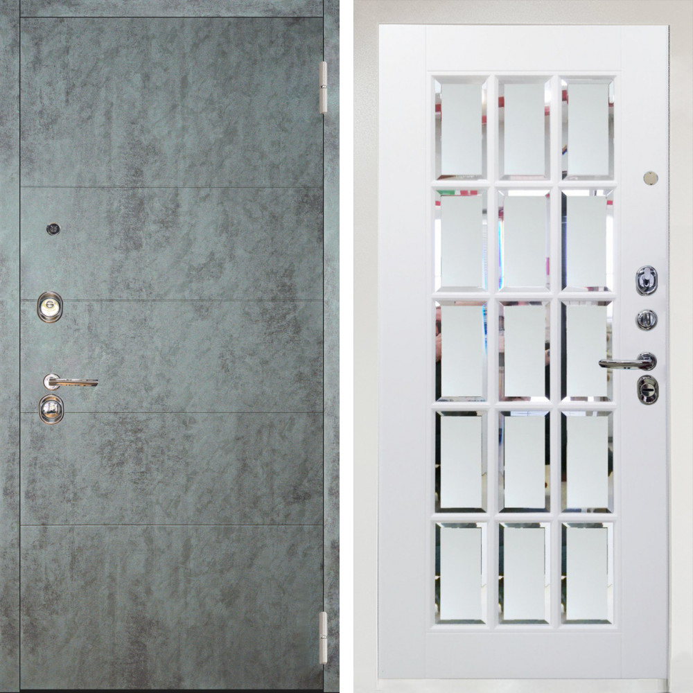 Входная дверь Аргус ЛЮКС 3К Снежно-белый Агат Темный бетон + Мэрелин Софт милк с фацетом и пескоструем