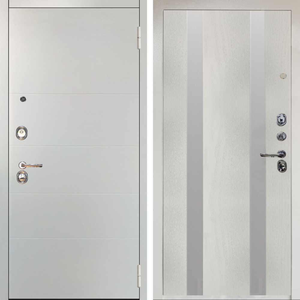 Входная дверь Эстет Белый Мат с внутренней отделкой Зеркало бетон светлый • Габаритные размеры: 2050x860 мм, 2050x960 мм • Металл 1.8мм • Внешнее покрытие: МДФ 16 мм. • Толщина полотна: 115 мм. • Толщина коробки: 120 мм. • Короб закрытого типа, утепленный • Уплотнитель: 3 контура • Два вертикальных ребра жесткости • Замок основной: Гардиан 6211 с блокировкой язычка • Замок дополнительный: Гардиан 6001 • Врезная броненакладка • Пазы на коробке под доборы • Независимая задвижка есть • Фурнитура Хром