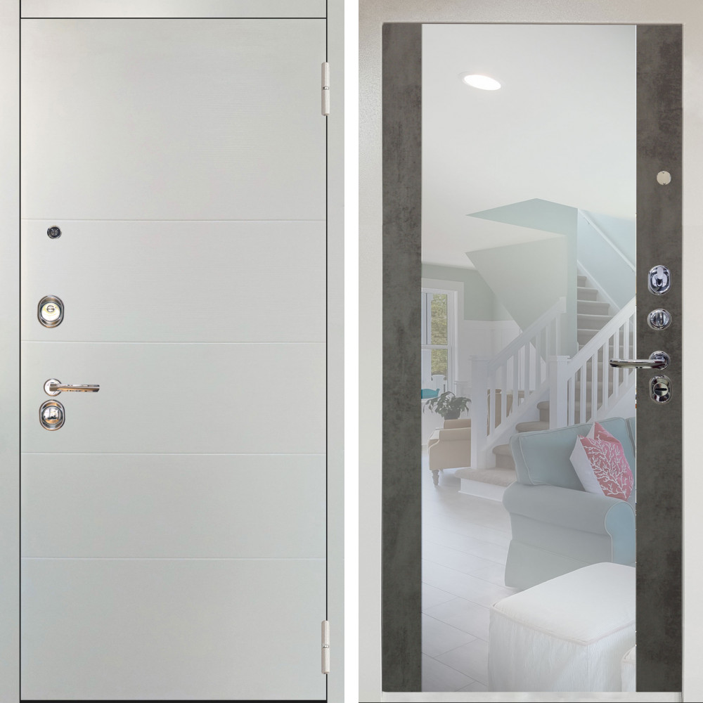 Входная дверь Премиум Бетон Темный с внутренней отделкой Зеркало СБ-16 сандал белый • Габаритные размеры: 2050x860 мм, 2050x960 мм • Металл 1.8мм • Внешнее покрытие: МДФ 16 мм. • Толщина полотна: 115 мм. • Толщина коробки: 120 мм. • Короб закрытого типа, утепленный • Уплотнитель: 3 контура • Два вертикальных ребра жесткости • Замок основной: Гардиан 6211 с блокировкой язычка • Замок дополнительный: Гардиан 6001 • Врезная броненакладка • Пазы на коробке под доборы • Независимая задвижка есть • Фурнитура Хром