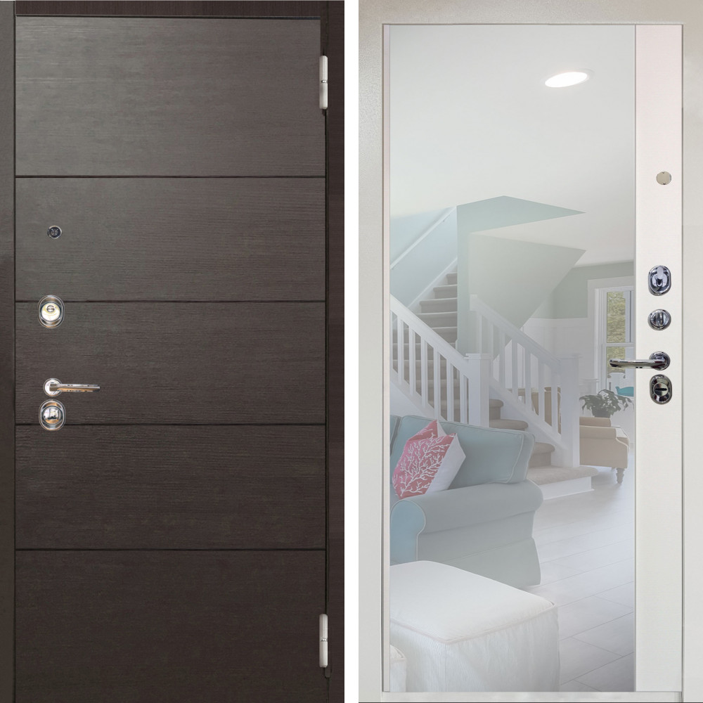 Входная дверь Квадро с внутренней отделкой Зеркало эко дуб • Габаритные размеры: 2050x860 мм, 2050x960 мм • Металл 1.5мм. • Внешнее покрытие: МДФ 12 мм. • Цвет покрытия: Черный кварц. • Толщина полотна: 100 мм. • Толщина коробки: 105 мм. • Окрас короба:Черная шагрень. • Короб закрытого типа, утепленный. • Уплотнитель: 3 контура. • Два вертикальных ребра жесткости. • Замок основной: Guardian 3211 (цилиндровый). • Замок дополнительный: Guardian 300 • Врезная броненакладка. • Независимая задвижка есть. • Фурнитура Черная.