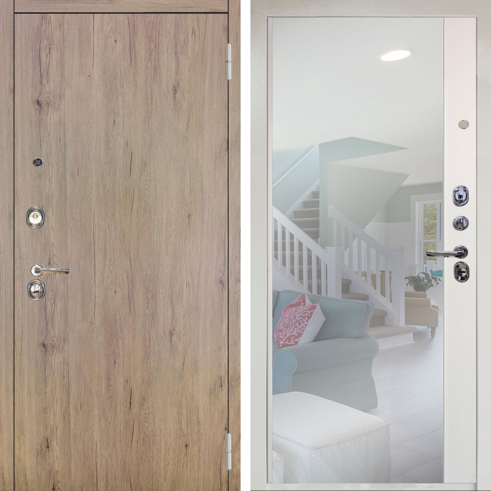 Входная дверь Оникс с стеклянной черной вставкой с внутренней отделкой Зеркало белый софт • Габаритные размеры: 2050x860 мм, 2050x960 мм • Металл 1.5мм. • Внешнее покрытие: МДФ 12 мм. • Цвет покрытия: Дуб американский/Черный кварц. • Толщина полотна: 100 мм. • Толщина коробки: 105 мм. • Окрас короба:Черная шагрень. • Короб закрытого типа, утепленный. • Уплотнитель: 3 контура. • Два вертикальных ребра жесткости. • Замок основной: Guardian 3211 (цилиндровый). • Замок дополнительный: Guardian 3001 (сувальдный). • Врезная броненакладка. • Независимая задвижка есть. • Фурнитура Черная.