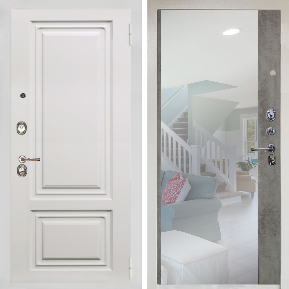 Входная дверь Агата Вайт (Бел мат, черное стекло) с внутренней отделкой Зеркало бетон светлый • Габаритные размеры: 2050x860 мм, 2050x960 мм • Металл 1.8мм • Внешнее покрытие: МДФ 16 мм. • Толщина полотна: 115 мм. • Толщина коробки: 120 мм. • Короб закрытого типа, утепленный • Уплотнитель: 3 контура • Два вертикальных ребра жесткости • Замок основной: Гардиан 6211 с блокировкой язычка • Замок дополнительный: Гардиан 6001 • Врезная броненакладка • Пазы на коробке под доборы • Независимая задвижка есть • Фурнитура Черная