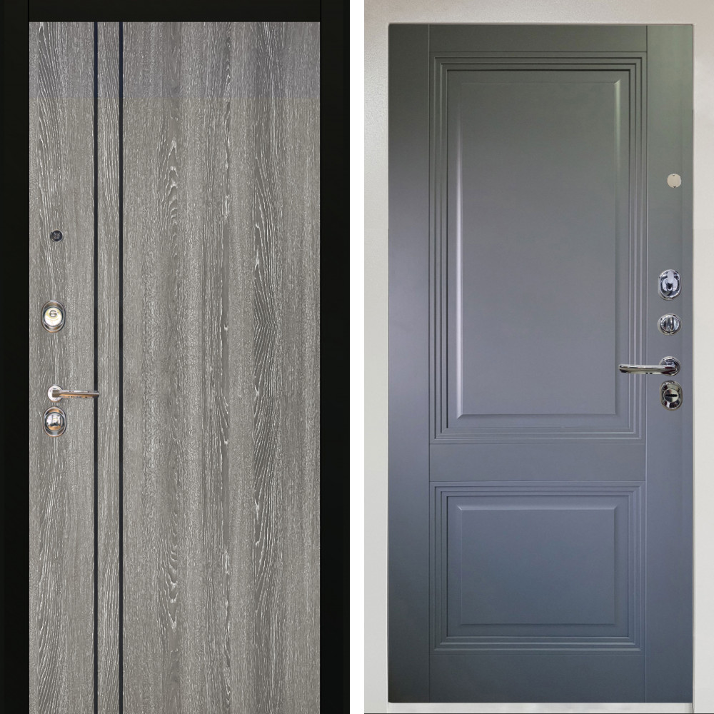 Входная дверь Вертика с внутренней отделкой Вертикаль Силк маус • Габаритные размеры: 2050x860 мм, 2050x960 мм • Металл 1.8мм • Внешнее покрытие: МДФ 16 мм белый мат с молдингом черная лакобель • Толщина полотна: 115 мм. • Толщина коробки: 120 мм. • Короб закрытого типа, утепленный • Уплотнитель: 3 контура • Два вертикальных ребра жесткости • Замок основной: Гардиан 6211 с блокировкой язычка • Замок дополнительный: Гардиан 6001 • Врезная броненакладка • Пазы на коробке под доборы • Независимая задвижка есть • Фурнитура Черная