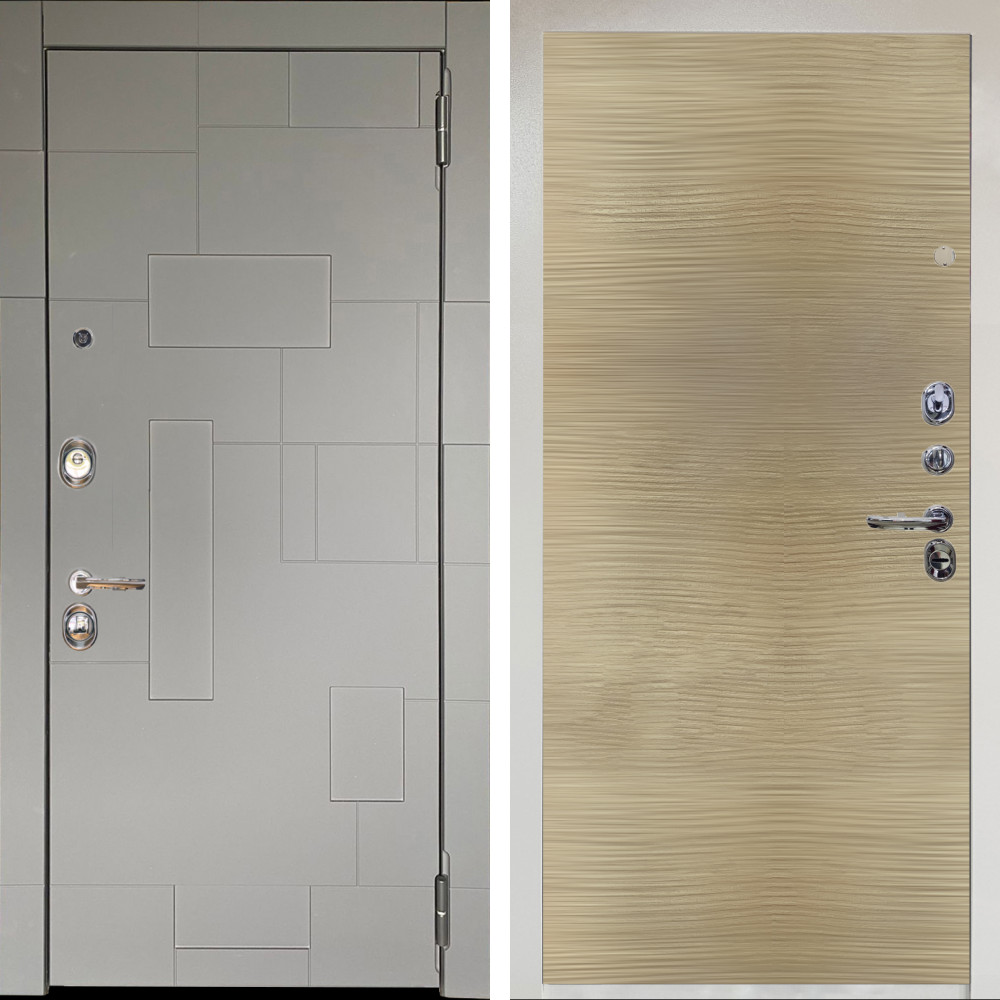 Входная дверь Termo-Door с утеплением: внешняя отделка Спейс Дуб Патина, внутренняя отделка Лион Grey софт.Толщина полотна 100 мм., цилиндровый замок, доставка и установка в Москве и МО, гарантия 1 год.