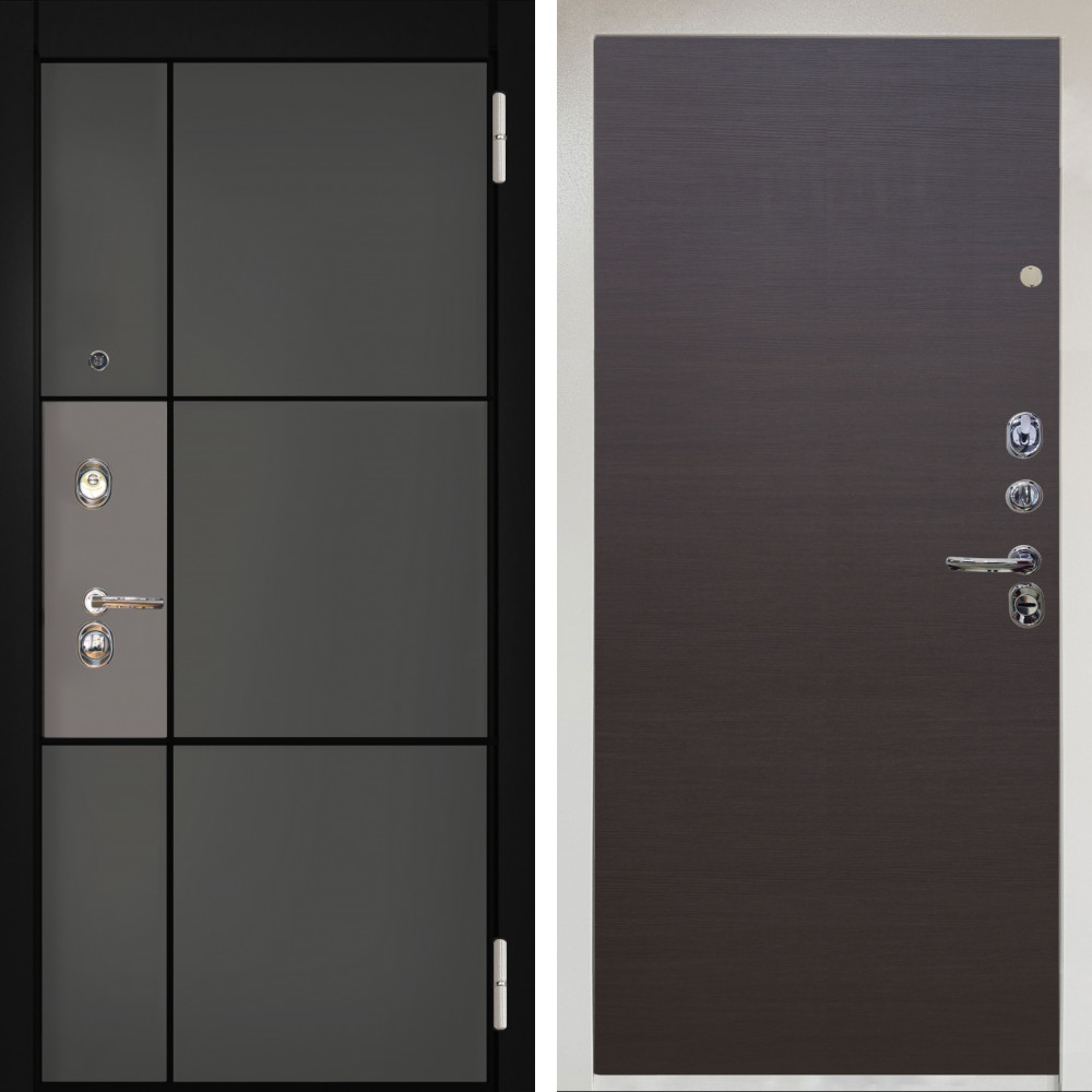 Входная дверь Квадро с внутренней отделкой Зеркало венге • Габаритные размеры: 2050x860 мм, 2050x960 мм • Металл 1.5мм. • Внешнее покрытие: МДФ 12 мм. • Цвет покрытия: Черный кварц. • Толщина полотна: 100 мм. • Толщина коробки: 105 мм. • Окрас короба:Черная шагрень. • Короб закрытого типа, утепленный. • Уплотнитель: 3 контура. • Два вертикальных ребра жесткости. • Замок основной: Guardian 3211 (цилиндровый). • Замок дополнительный: Guardian 300 • Врезная броненакладка. • Независимая задвижка есть. • Фурнитура Черная.