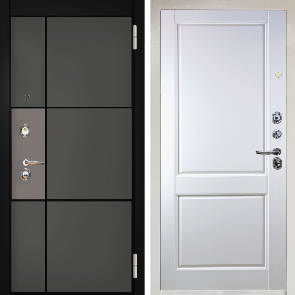Входная дверь Вертика с внутренней отделкой Классика венге • Габаритные размеры: 2050x860 мм, 2050x960 мм • Металл 1.8мм • Внешнее покрытие: МДФ 16 мм белый мат с молдингом черная лакобель • Толщина полотна: 115 мм. • Толщина коробки: 120 мм. • Короб закрытого типа, утепленный • Уплотнитель: 3 контура • Два вертикальных ребра жесткости • Замок основной: Гардиан 6211 с блокировкой язычка • Замок дополнительный: Гардиан 6001 • Врезная броненакладка • Пазы на коробке под доборы • Независимая задвижка есть • Фурнитура Черная