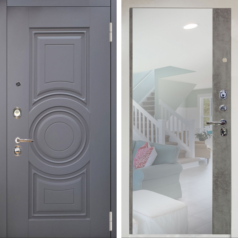 Входная дверь Лофт Бетон Светлый с внутренней отделкой Зеркало сандал белый • Габаритные размеры: 2050x860 мм, 2050x960 мм • Металл 1.8мм • Внешнее покрытие: МДФ 16 мм. • Толщина полотна: 115 мм. • Толщина коробки: 120 мм. • Короб закрытого типа, утепленный • Уплотнитель: 3 контура • Два вертикальных ребра жесткости • Замок основной: Гардиан 6211 с блокировкой язычка • Замок дополнительный: Гардиан 6001 • Врезная броненакладка • Пазы на коробке под доборы • Независимая задвижка есть • Фурнитура Хром