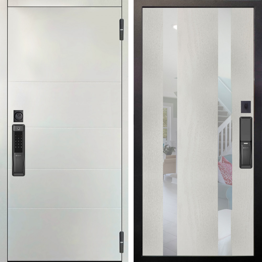 Входная дверь Вертикаль Блек SMART с внутренней отделкой Эверест нерж белый матовый • Габаритные размеры: 2050x860 мм, 2050x960 мм • Металл 1.8мм. Черная шагрень • Внешнее покрытие: МДФ 12 мм. • Толщина полотна: 115 мм. • Толщина коробки: 120 мм. • Короб закрытого типа, утепленный • Уплотнитель: 3 контура • Два вертикальных ребра жесткости • ЭЛЕКТРОННЫЙ ЗАМОК НА ВЫБОР • Замок дополнительный: Гардиан 6001 • Врезная броненакладка • Пазы на коробке под доборы • Независимая задвижка есть • Фурнитура ЧЕРНАЯ