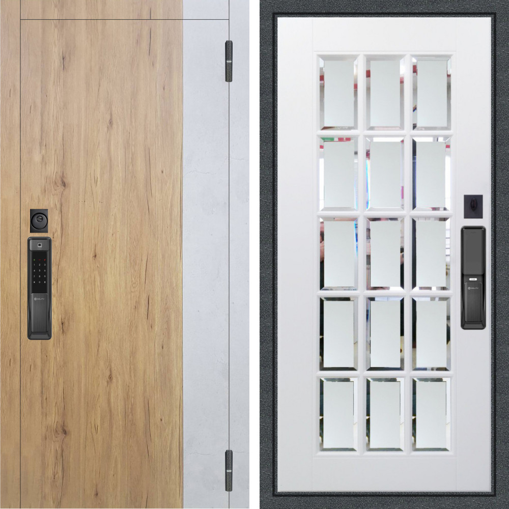 Входная дверь Аргус SMART Эксперт Рустик соломенный вставка бетон урбан милк + Мэрелин Софт милк зеркало с фацетом и пескоструем