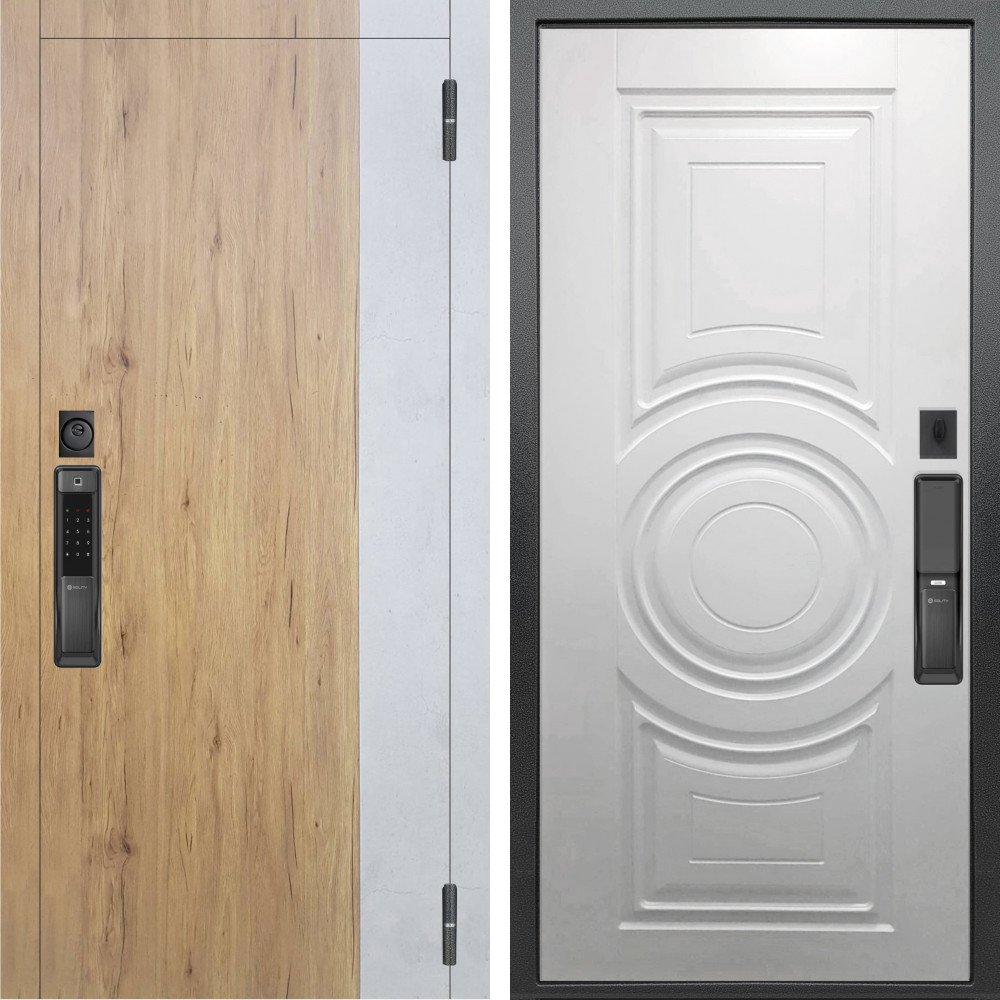 Входная дверь Вертика с внутренней отделкой Зеркало бетон светлый • Габаритные размеры: 2050x860 мм, 2050x960 мм • Металл 1.8мм • Внешнее покрытие: МДФ 16 мм белый мат с молдингом черная лакобель • Толщина полотна: 115 мм. • Толщина коробки: 120 мм. • Короб закрытого типа, утепленный • Уплотнитель: 3 контура • Два вертикальных ребра жесткости • Замок основной: Гардиан 6211 с блокировкой язычка • Замок дополнительный: Гардиан 6001 • Врезная броненакладка • Пазы на коробке под доборы • Независимая задвижка есть • Фурнитура Черная