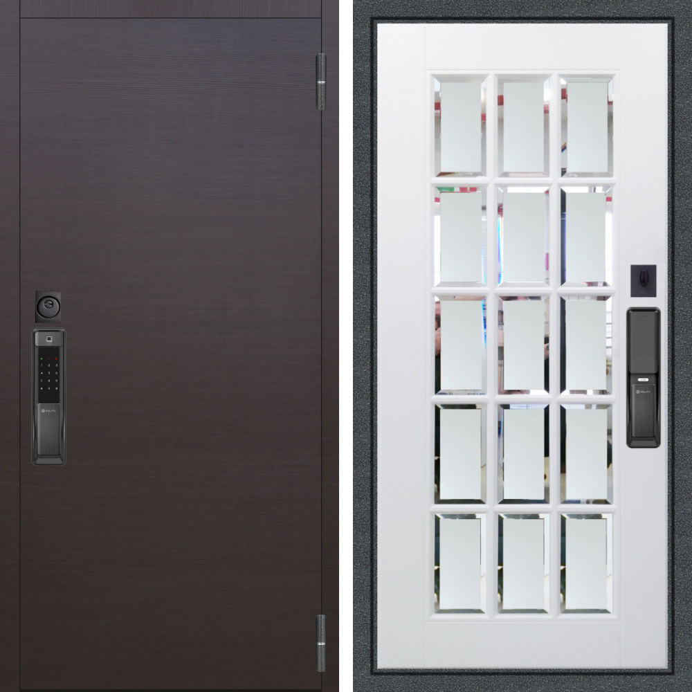 Входная дверь Квадро SMART с внутренней отделкой Зеркало панорама Белый софт • Габаритные размеры: 2050x860 мм, 2050x960 мм • Металл 1.8мм. Черная шагрень • Внешнее покрытие: МДФ 12 мм. • Толщина полотна: 115 мм. • Толщина коробки: 120 мм. • Короб закрытого типа, утепленный • Уплотнитель: 3 контура • Два вертикальных ребра жесткости • ЭЛЕКТРОННЫЙ ЗАМОК НА ВЫБОР • Замок дополнительный: Гардиан 6001 • Врезная броненакладка • Пазы на коробке под доборы • Независимая задвижка есть • Фурнитура ЧЕРНАЯ