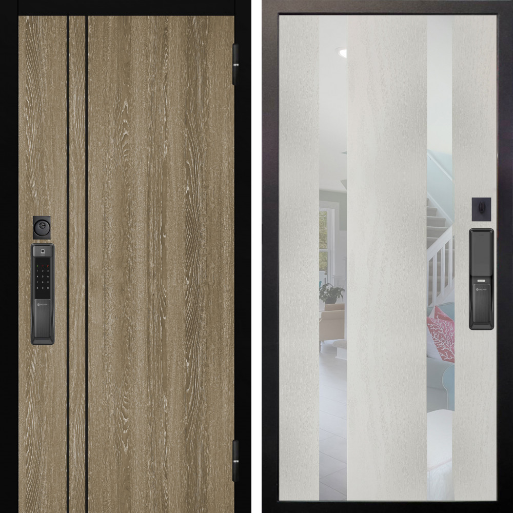 Входная дверь Termo-Door с утеплением: внешняя отделка Смарт Орегон White, внутренняя отделка Зеркало Фацет Черный кварц+тонировка серая.Толщина полотна 95 мм, цилиндровый замок, доставка и установка в Москве и МО, гарантия 1 год.