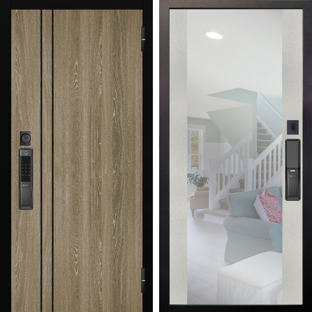 Входная дверь Квадро SMART с внутренней отделкой Зеркало панорама Графит • Габаритные размеры: 2050x860 мм, 2050x960 мм • Металл 1.8мм. Черная шагрень • Внешнее покрытие: МДФ 12 мм. • Толщина полотна: 115 мм. • Толщина коробки: 120 мм. • Короб закрытого типа, утепленный • Уплотнитель: 3 контура • Два вертикальных ребра жесткости • ЭЛЕКТРОННЫЙ ЗАМОК НА ВЫБОР • Замок дополнительный: Гардиан 6001 • Врезная броненакладка • Пазы на коробке под доборы • Независимая задвижка есть • Фурнитура ЧЕРНАЯ
