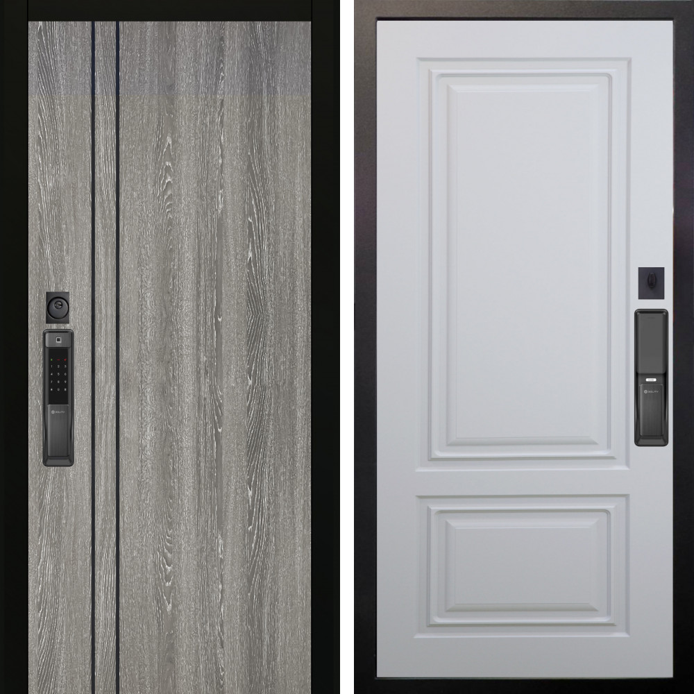 Входная дверь Шторм Графит SMART с внутренней отделкой Гладкая белый матовый • Габаритные размеры: 2050x860 мм, 2050x960 мм • Металл 1.8мм. Черная шагрень • Внешнее покрытие: МДФ 12 мм. • Толщина полотна: 115 мм. • Толщина коробки: 120 мм. • Короб закрытого типа, утепленный • Уплотнитель: 3 контура • Два вертикальных ребра жесткости • ЭЛЕКТРОННЫЙ ЗАМОК НА ВЫБОР • Замок дополнительный: Гардиан 6001 • Врезная броненакладка • Пазы на коробке под доборы • Независимая задвижка есть • Фурнитура ЧЕРНАЯ