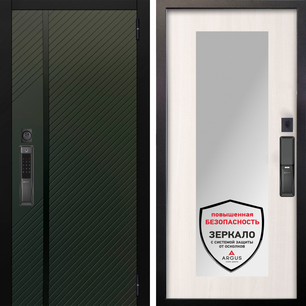 Входная дверь Шторм Графит SMART с внутренней отделкой Зеркало панорама Белый софт • Габаритные размеры: 2050x860 мм, 2050x960 мм • Металл 1.8мм. Черная шагрень • Внешнее покрытие: МДФ 12 мм. • Толщина полотна: 115 мм. • Толщина коробки: 120 мм. • Короб закрытого типа, утепленный • Уплотнитель: 3 контура • Два вертикальных ребра жесткости • ЭЛЕКТРОННЫЙ ЗАМОК НА ВЫБОР • Замок дополнительный: Гардиан 6001 • Врезная броненакладка • Пазы на коробке под доборы • Независимая задвижка есть • Фурнитура ЧЕРНАЯ