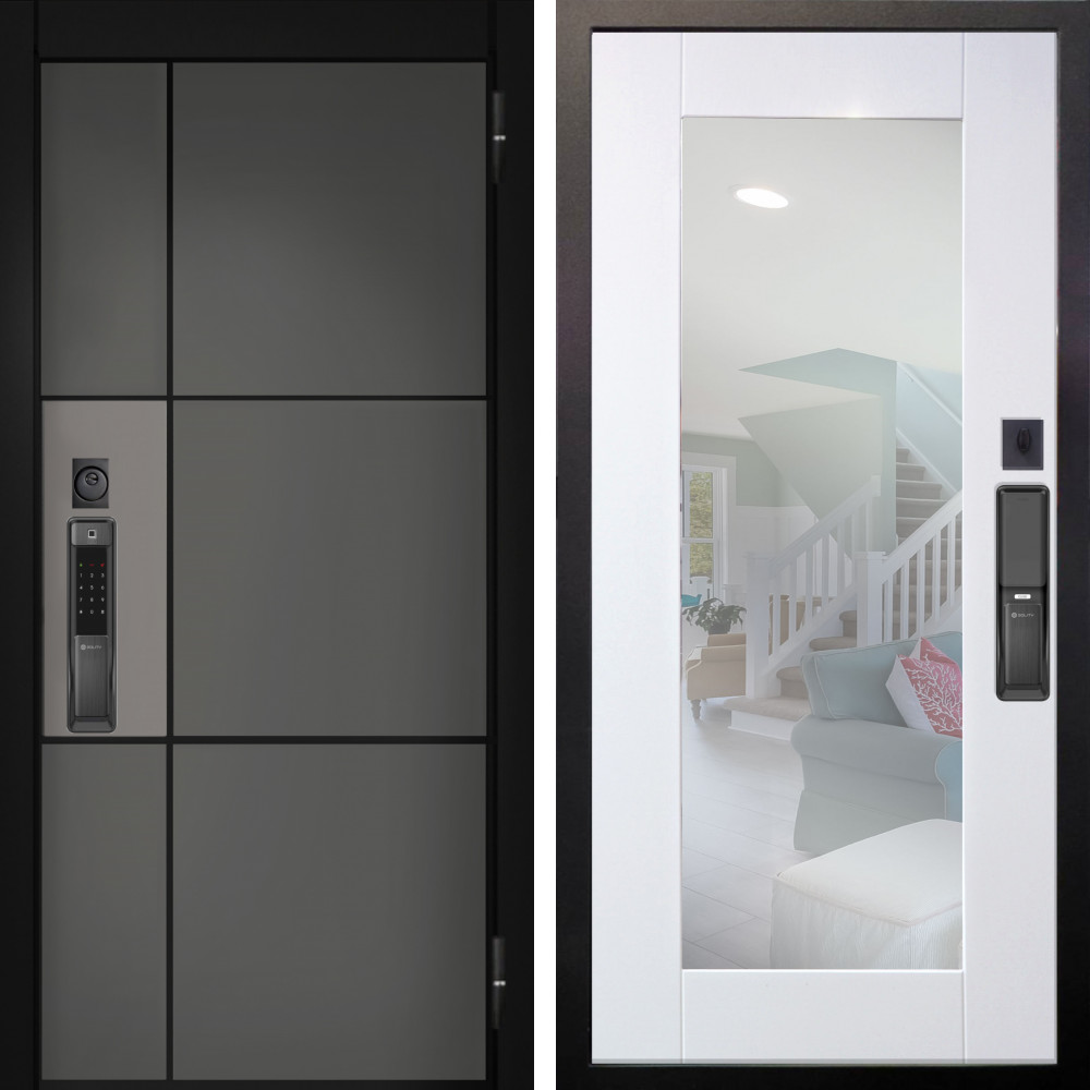Входная дверь Квадро с внутренней отделкой Зеркало панорама Черный кварц • Габаритные размеры: 2050x860 мм, 2050x960 мм • Металл 1.5мм. • Внешнее покрытие: МДФ 12 мм. • Цвет покрытия: Черный кварц. • Толщина полотна: 100 мм. • Толщина коробки: 105 мм. • Окрас короба:Черная шагрень. • Короб закрытого типа, утепленный. • Уплотнитель: 3 контура. • Два вертикальных ребра жесткости. • Замок основной: Guardian 3211 (цилиндровый). • Замок дополнительный: Guardian 300 • Врезная броненакладка. • Независимая задвижка есть. • Фурнитура Черная.