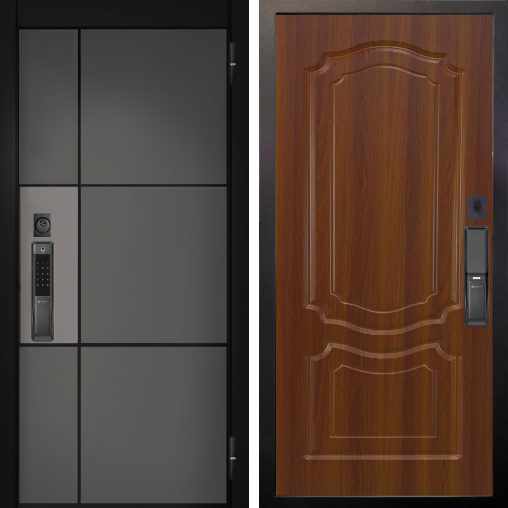 Входная дверь Termo-Door с утеплением: внешняя отделка Смарт Урбан Black, внутренняя отделка Мадрид Дуб.Толщина полотна 95 мм, цилиндровый замок, доставка и установка в Москве и МО, гарантия 1 год.