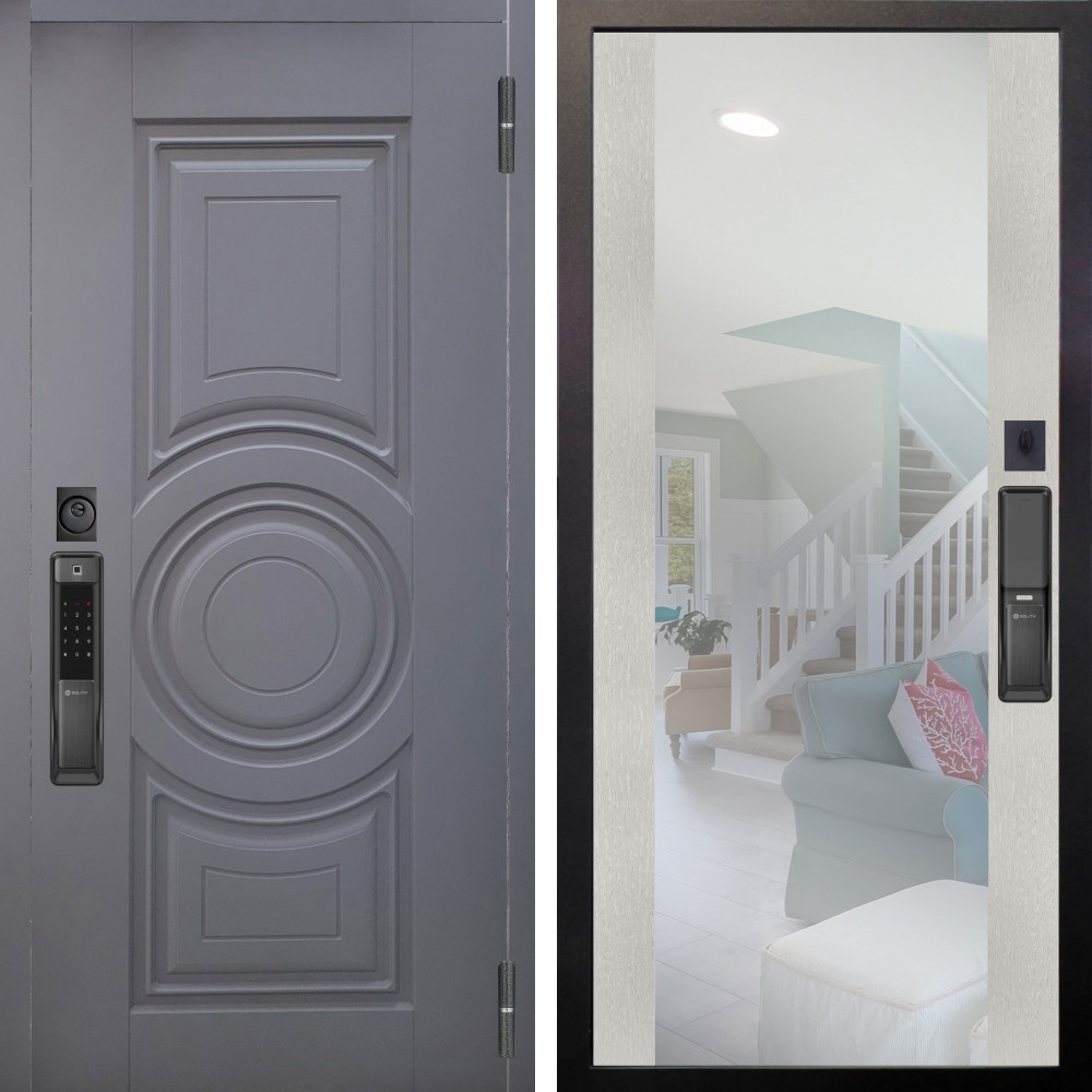 Входная дверь Домино с внутренней отделкой Зеркало сб-16 черный кварц • Габаритные размеры: 2050x860 мм, 2050x960 мм • Металл 1.8мм • Внешнее покрытие: МДФ 16 мм. • Толщина полотна: 115 мм. • Толщина коробки: 120 мм. • Короб закрытого типа, утепленный • Уплотнитель: 3 контура • Два вертикальных ребра жесткости • Замок основной: Гардиан 6211 с блокировкой язычка • Замок дополнительный: Гардиан 6001 • Врезная броненакладка • Пазы на коробке под доборы • Независимая задвижка есть • Фурнитура ХРОМ