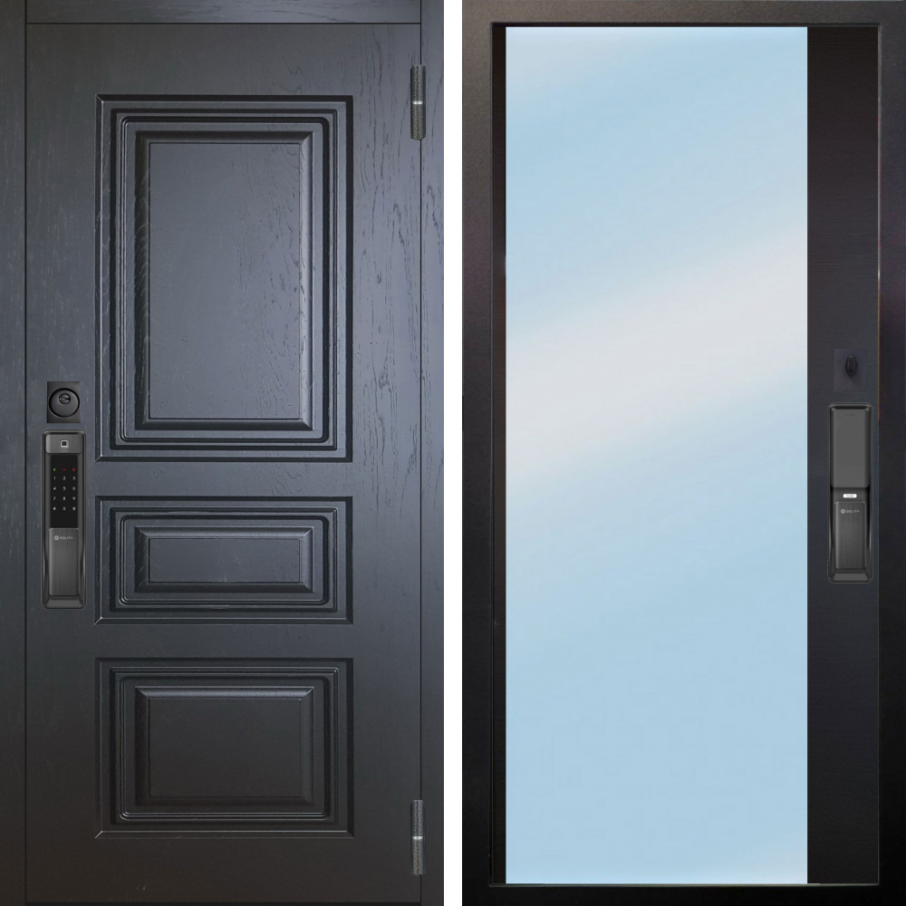 Входная дверь Вертикаль Блек SMART с внутренней отделкой Зеркало панорама Белый софт • Габаритные размеры: 2050x860 мм, 2050x960 мм • Металл 1.8мм. Черная шагрень • Внешнее покрытие: МДФ 12 мм. • Толщина полотна: 115 мм. • Толщина коробки: 120 мм. • Короб закрытого типа, утепленный • Уплотнитель: 3 контура • Два вертикальных ребра жесткости • ЭЛЕКТРОННЫЙ ЗАМОК НА ВЫБОР • Замок дополнительный: Гардиан 6001 • Врезная броненакладка • Пазы на коробке под доборы • Независимая задвижка есть • Фурнитура ЧЕРНАЯ
