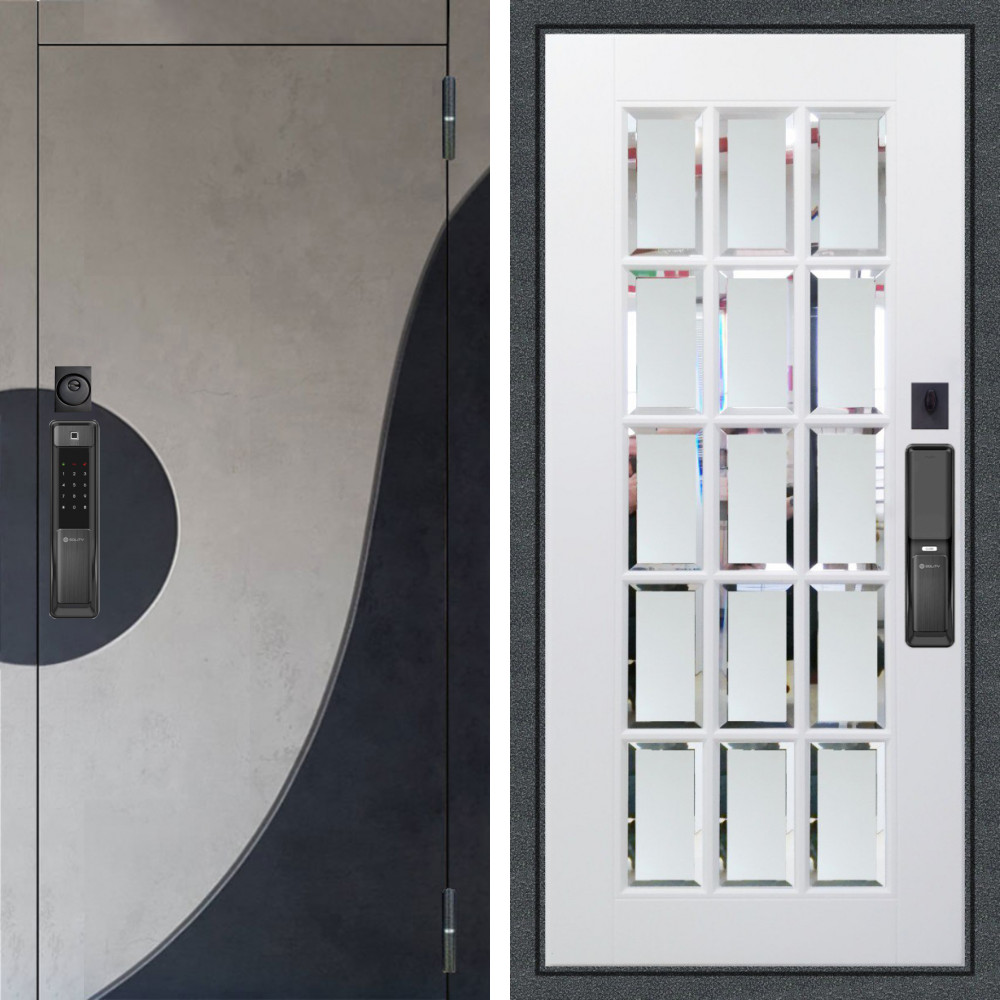 Входная дверь Аргус SMART Стен Бетон урбан милк вставка бетон урбан индиго + Мэрелин Софт милк зеркало с фацетом и пескоструем