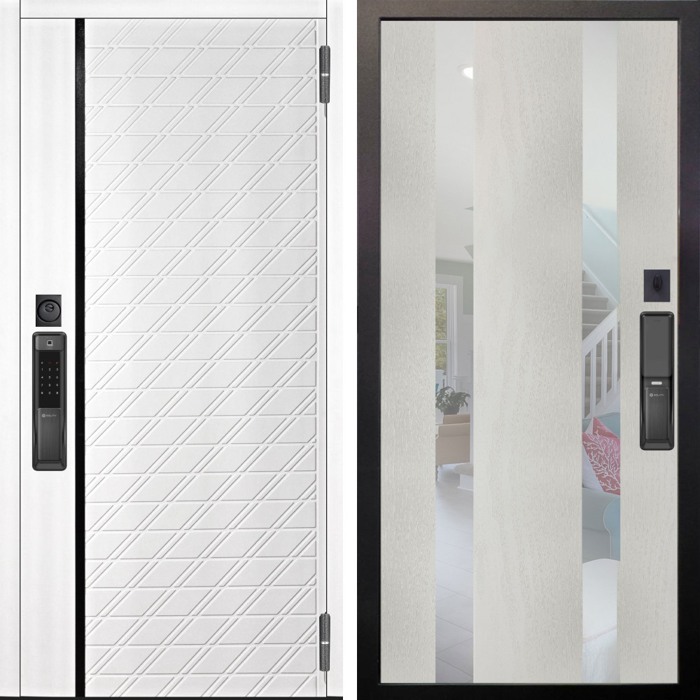 Входная дверь Termo-Door с утеплением: внешняя отделка Смарт Тренд White, внутренняя отделка Зеркало Фацет Черный кварц+тонировка серая.Толщина полотна 95 мм, цилиндровый замок, доставка и установка в Москве и МО, гарантия 1 год.