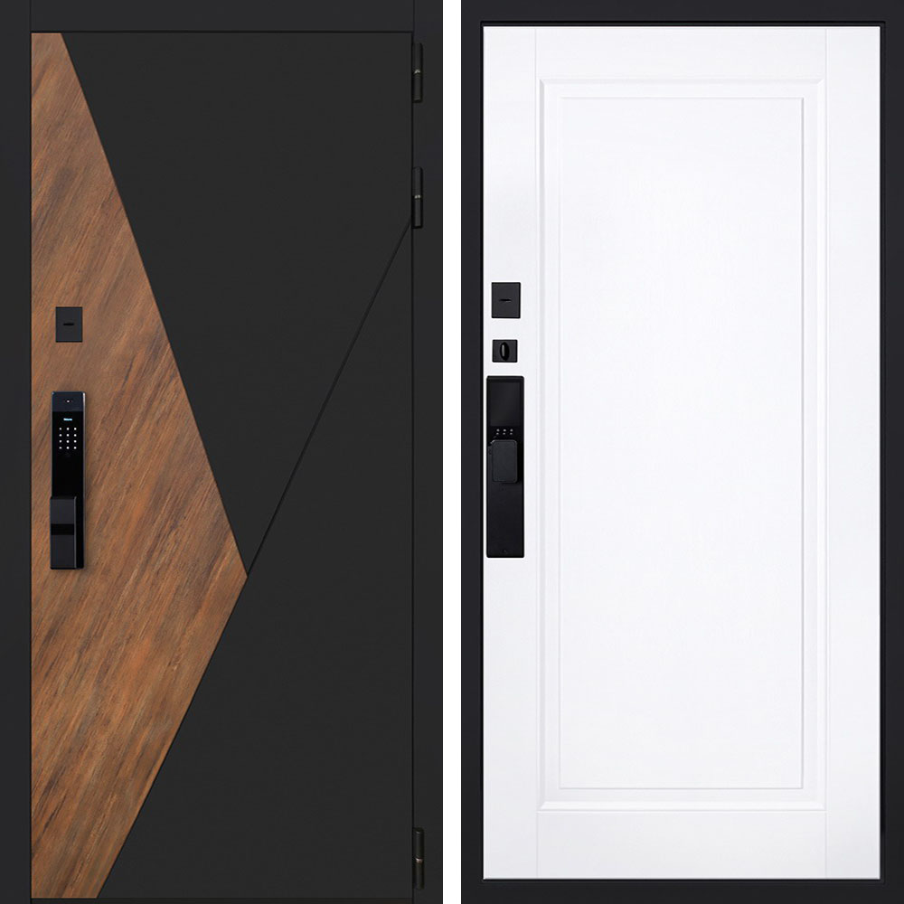 Входная дверь • Габаритные размеры: 2050x860 мм, 2050x960 мм • Металл 1.8мм • Внешнее покрытие: МДФ 16 мм. • Толщина полотна: 115 мм. • Толщина коробки: 120 мм. • Короб закрытого типа, утепленный • Уплотнитель: 3 контура • Два вертикальных ребра жесткости • Замок основной: Гардиан 6211 с блокировкой язычка • Замок дополнительный: Гардиан 6001 • Врезная броненакладка • Пазы на коробке под доборы • Независимая задвижка есть • Фурнитура Черная