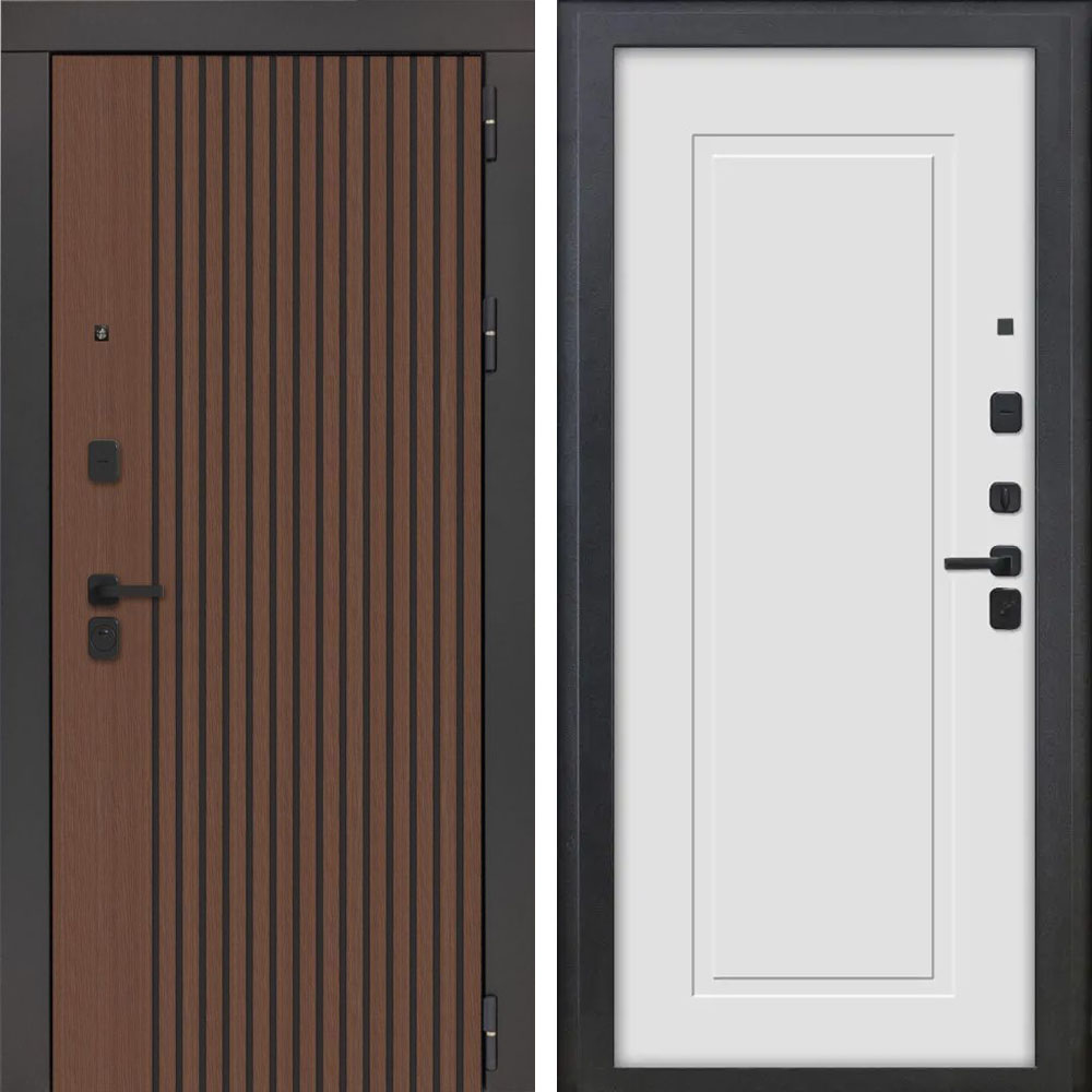 Входная дверь • Габаритные размеры: 2050x860 мм, 2050x960 мм • Металл 1.8мм • Внешнее покрытие: МДФ 16 мм. • Толщина полотна: 115 мм. • Толщина коробки: 120 мм. • Короб закрытого типа, утепленный • Уплотнитель: 3 контура • Два вертикальных ребра жесткости • Замок основной: Гардиан 6211 с блокировкой язычка • Замок дополнительный: Гардиан 6001 • Врезная броненакладка • Пазы на коробке под доборы • Независимая задвижка есть • Фурнитура Черная